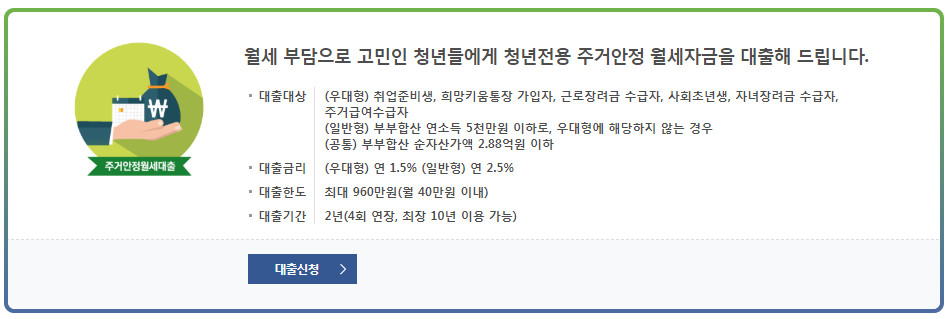 오늘은 그 중 청년전용 주거안정월세대출을 소개해 드리도록 하겠습니다.