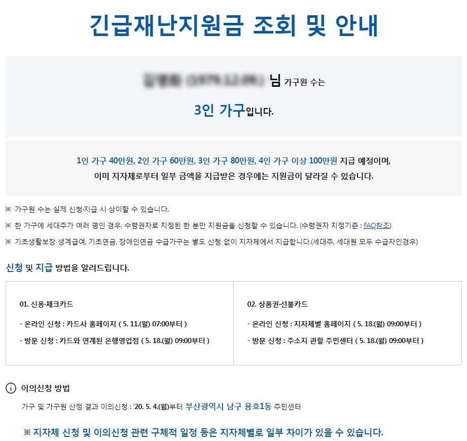 본인의 성명과 주민등록번호를 입력하면 아래와 같이 가구원수가 확인이 됩니다. 저는 와이프, 아들이 있으므로 3인 가구이며 긴급재난지원금은 3인 가구 기준 80만원을 지급 받을 것이란 걸 확인이 가능 합니다.