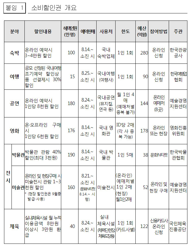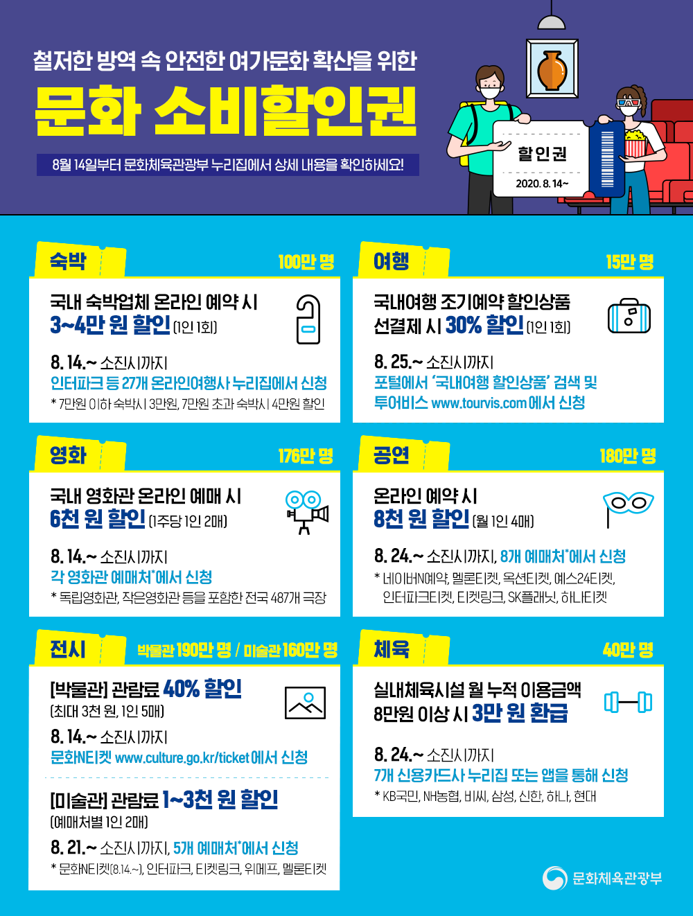 문화체육관광부(장관 박양우, 이하 문체부)는 코로나19로 인해 침체된 내수시장을 살리고, 국민들의 ‘새로운 일상’과 안전한 여가문화 확산을 위해 숙박‧여행‧공연‧전시‧영화‧체육 6개 분야에 3차 추경을 통해 마련한 예산을 투입, 분야별 선착순으로 총 861만 명에게 문화 소비할인권을 제공합니다.