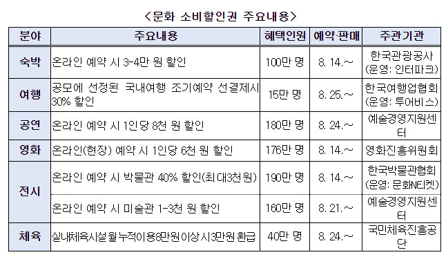 숙박·영화·전시(박물관)는 8월 14일부터, 미술전시는 21일부터, 공연·체육은 24일부터, 여행은 25일부터 분야별 주관기관과 참여업체 누리집 등을 통해 문화 소비할인권을 신청할 수 있습니다. 문체부는 국민들의 소비 활동 증가에 따른 코로나 감염 위험에 대비, 철저한 방역을 기반으로 사업을 추진할 방침입니다.