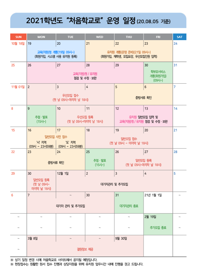 2021학년도 유치원 원아 모집을 위한 유치원 입학관리시스템인 '처음학교로'가 오늘(30일) 개통되었습니다. 처음학교로는 유치원을 직접 방문하지 않고 온라인으로 지원하고 결과를 확인할 수 있는 시스템인데요.