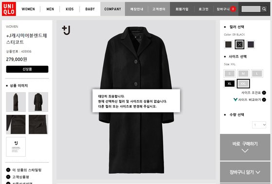 유니클로 온라인에서도 +J 컬렉션의 인기는 뜨거웠습니다. 같은 날 오전 8시 온라인 홈페이지에서 판매가 시작됐고, 시작과 동시에 인기 품목의 주요 사이즈가 동났습니다. +J 컬렉션의 대표 상품인 ‘여성용 하이브리드 다운쇼트 코트’의 경우 일부 특대 사이즈를 제외하고는 오픈과 동시에 품절됐습니다. 또 다른 인기 품목인 ‘캐시미어 블렌드 오버사이즈 재킷’ 역시 인기 사이즈는 빠르게 품절됐습니다.